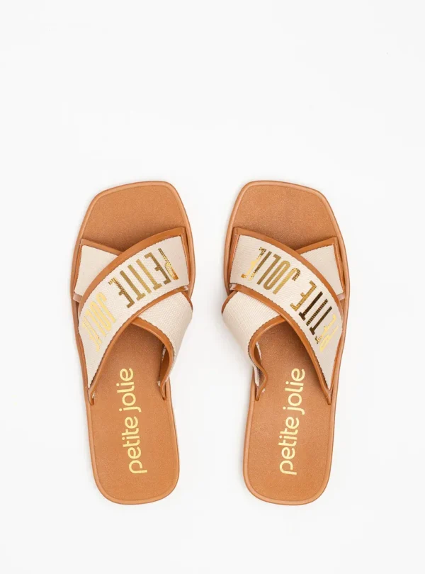 Chinelo de dedo, estilo rasteirinha, produzido em J-Lastic com duas tiras largas transpassadas, formando um X. As tiras têm logomania da Petite Jolie, o bico é quadrado, deixando dedos e calcanhar à mostra.