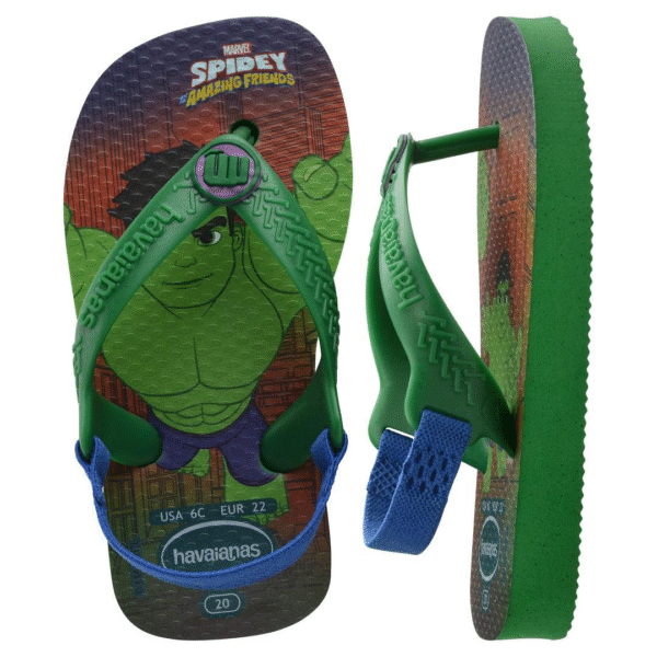 Os bebês também podem ter Havaianas com os super-heróis da Marvel! Nessa versão, os personagens – Hulk, Pantera Negra e Homem-Aranha – são ilustrados em versão baby e as tiras têm um pequeno acessório na parte central que conversa com a estampa. Além de linda, a sandália é confortável e segura para quem está dando os primeiros passinhos.